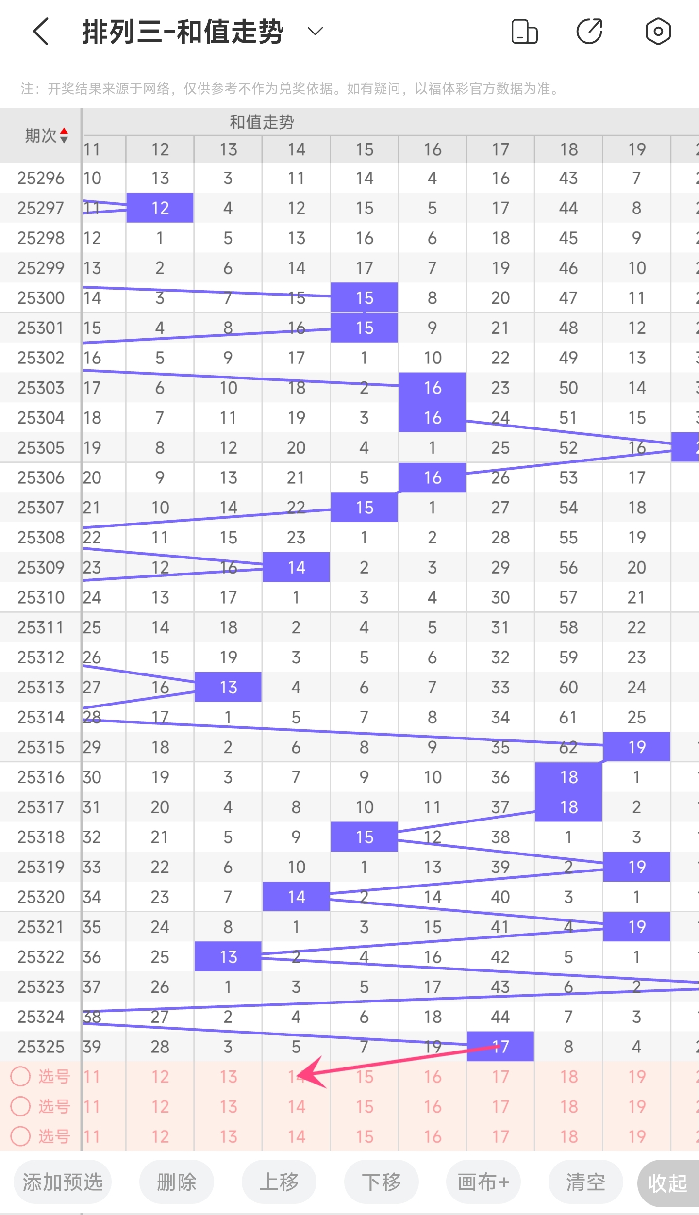 上期和值为17,往前一期和值为9,趋势往右移动,偏移量为8。通过走势图分析,17和值是近30期内开出比较大的和值,下降空间比较大,上升空间比较小。本期看好和值变小,因此推测本期趋势是往左的,和值会变小,小概率往右,和值变大。