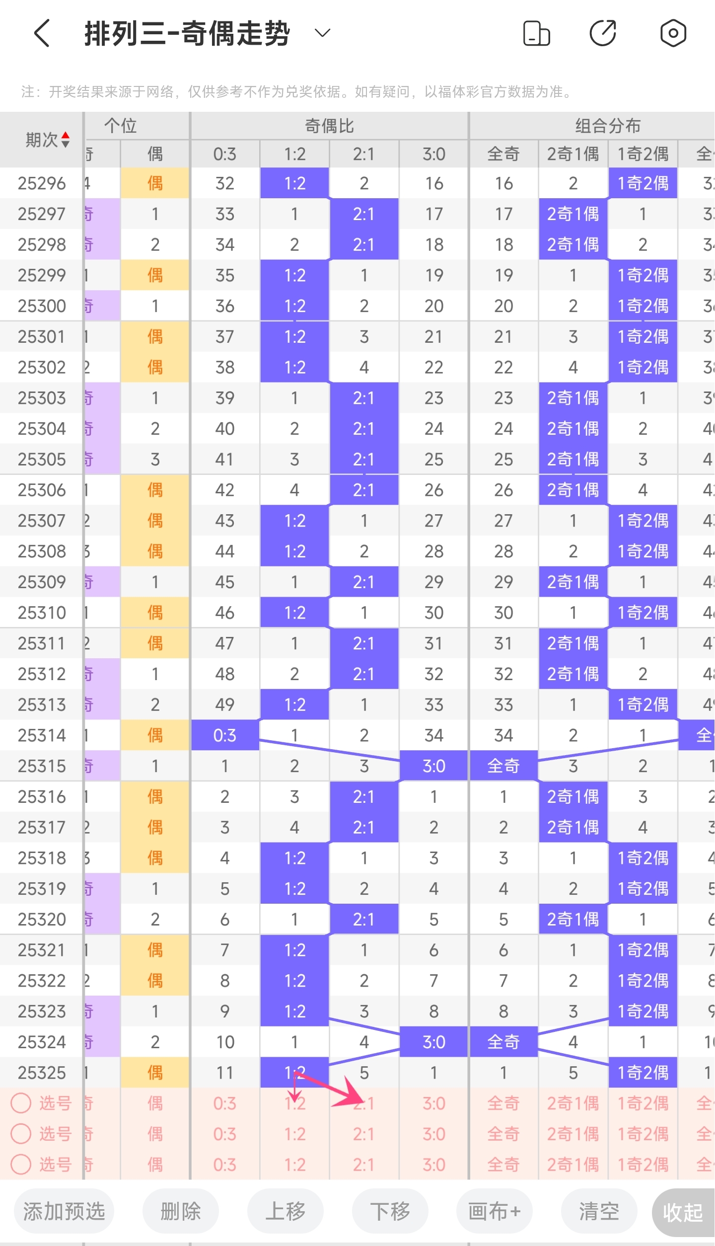 上期开出了1:2的奇偶比。往前一期是3:0奇偶比。通过分析奇偶走势图,近30期内开出1:2奇偶比的次数是15次,开出2:1奇偶比的次数是12次,3:0是2次,0:3是1次。和前一期相比,次数没有发生变化。通过走势图分析,2:1已经5期没有开出,本期看好回补,看好2:1奇偶比。所以推测本期可能开2:1奇偶比,其次是1:2奇偶比,最后是3:0或者0:3奇偶比。