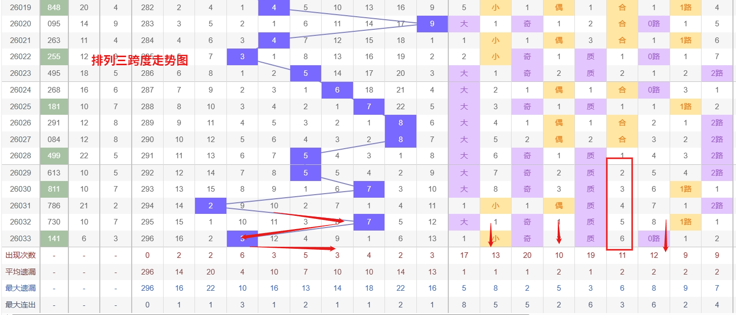 排列三 跨度分析:从上图可以看出近100期的跨度大小比约为55比45,跨度奇偶比约为47比53总体来看还是比较均衡的,但跨度大小之间有点差异。我们再从历史开出3跨后下一期5跨度数据来做参考。最近10期跨度大小比约为6:4期开出大数跨度过多返回小数跨度的概率更高一点。历史开奖近2期出3跨以后的走势为301期开出3跨后下一期走5跨走出2振幅,第315期开出3跨后下一期走4跨走1振幅第326期开出3跨后下一期开出6跨走出4振幅。连续多期小振幅排列三跨度走势观察,近期排列三跨度走势中,5跨表现强势,频繁开出形成明确热态,从趋势惯性看仍具备连开潜力,需重点关注其持续走热的可能。与此同时,6跨近期处于温而不冷的状态,出现频率稳中有升,已有逐渐蓄力转热的迹象,应防范其热度突然上升形成新的出号焦点。整体而言,当前跨度走势呈现热点明确、温码升温的特点,在关注5跨连下的同时,也需对6跨的转热态势提前布局,出3跨度后容易走出2到4个跨度振幅的对称形态,跨度走出2到4个振幅看好的跨度有4569跨,所以第2026034期排列三跨度推荐4569跨。本文由一起彩钱是生命动力所著,请勿转载
