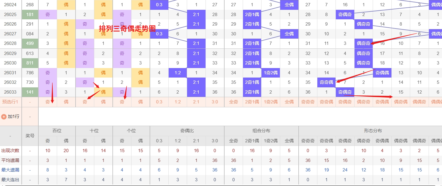 排列三 奇偶分析:从上图可以看出排列三100期内百位奇偶比约为52比48,十位奇偶比为47比53,个位奇偶比为54比46,百位的比值比较均衡,但是个位的比值偏差就有点大,历史奇偶形态近2期开出奇偶奇后下一期的走势为,第302期开出奇偶奇后303期开奇偶偶, 第314期开出奇偶奇后第315期开偶奇偶,第327期开出奇偶奇后第328期开偶偶奇,近期排列三奇偶走势中,“偶奇偶”组合频繁开出,形成明确的热态规律,其结构稳定性较强,短期内仍有延续可能,需作为重点跟踪模式。与此同时,“奇偶偶”组合近期呈现温而不冷的状态,出现频率有所回升,已显现出蓄力转热的迹象,需防范其热度快速上升形成新的出号焦点。整体来看,奇偶形态的走势正从单一热点向多点扩散过渡,在关注“偶奇偶”热态延续的同时,也应警惕“奇偶偶”组合转热带来的节奏变化,所以排列三2026034期偶奇偶形态推奇偶偶与偶奇偶。本文由一起彩钱是生命动力所著,请勿转载