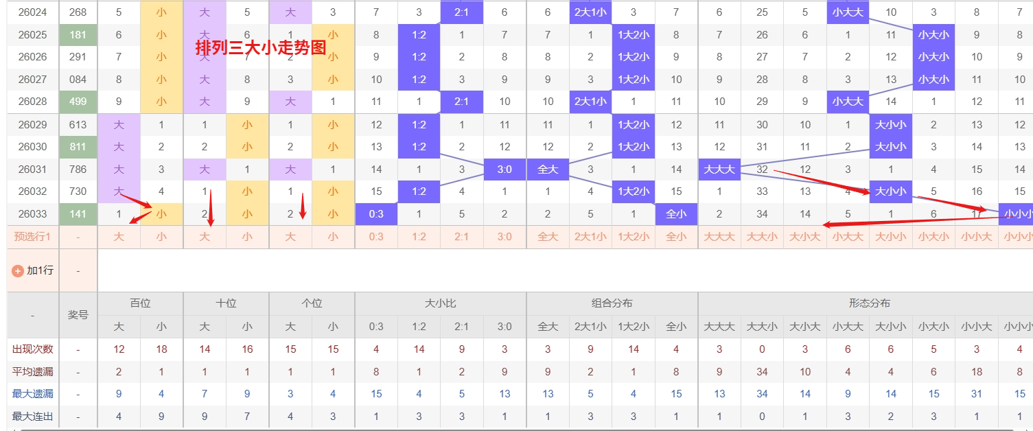 排列三 大小形态分析:从大小走势图上可以看出排列三100期内百位大小比约为52比48,十位大小比约为46:54,个位大小比约为55比45,除了个位和百位奇数比偶数多,十位偶数比奇数多。历史数据近2期开出小小小下一期的走势为,第302期开出小小小第303期开小小大。第312期开出小小小后第313期开大大小,第324期开出小小小后325期开大小大。排列三大小走势中,“小小大”组合近期出现频率稳中有升,已从温态逐渐显现出转热的迹象,其结构在大小均衡调整过程中可能成为新的关注点。另一方面,“大大小”组合已持续遗漏34期,形成明显的冷态格局,从历史周期与回补规律来看,此类长期遗漏的冷组合已进入理论反弹区间,值得密切关注其解冻信号。整体而言,当前大小走势呈现出“温号转热、冷号待补”的并存特点,所以排列三第2026034期大小形态推荐小小大防大大小。本文由一起彩钱是生命动力所著,请勿转载
