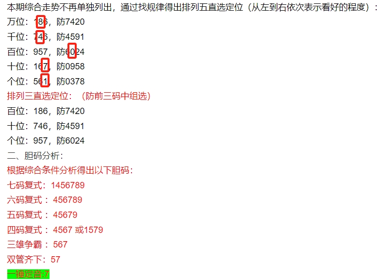 个位:1171全1路号连出4期,本期看好继续出1路号,看好417,1上次带出5,防本期1再次带出5。1多次带出8,防本期1继续带出8。23176期的6由716组合带出,23209期的3由713组合带出,防本期71组合继续带出63。