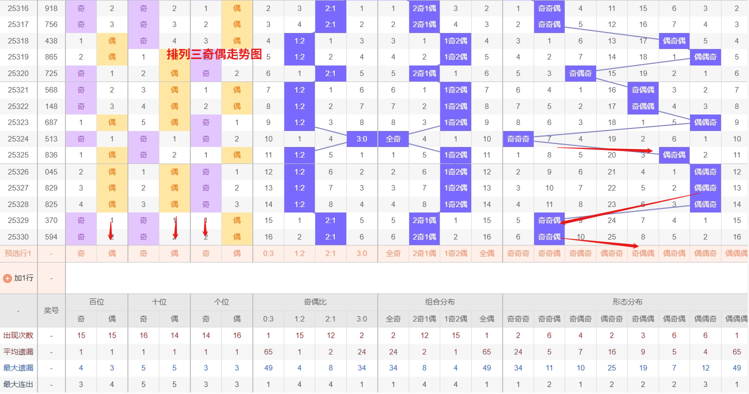 排列三 奇偶分析:从上图可以看出排列三100期内百位奇偶比约为48比52,十位奇偶比为45比55,个位奇偶比为53比47,百位的比值比较均衡,但是十位的比值偏差就有点大,历史奇偶形态近2期开出奇奇偶后下一期的走势为,第264期开出奇奇偶后265期开奇偶偶, 第282期开出奇奇偶后第283期开偶偶偶,第294期开出奇奇偶后第295期开偶奇偶,近期排列三奇偶形态走势中,“偶奇偶”组合持续活跃,呈现明显的热态特征。从历史出号规律来看,热态形态一旦形成趋势,往往具备一定的延续性,因此短期内“偶奇偶”仍有连下的可能,需作为重点跟踪对象。与此同时,“偶偶偶”全偶组合已遗漏较长时间,进入冷态区间。根据概率均衡原则,冷态组合随着遗漏值增长,其回补压力会逐渐增大,尤其在热号频繁出现的阶段,需警惕冷号突然反弹打破格局。所以排列三2025331期奇偶形态推偶奇偶与偶偶偶。本文由一起彩钱是生命动力所著,请勿转载