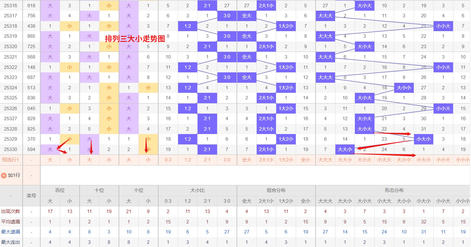 排列三 大小形态分析:从大小走势图上可以看出排列三100期内百位大小比约为55比45,十位大小比约为47:53,个位大小比约为51比49,除了个位和百位奇数比偶数多,十位是偶数比奇数多。历史数据近2期开出大大小下一期的走势为,第264期开出大大小第265期开小小大。第275期开出大大小后第276期开小小小,第295期开出大大小后296期开小大大。排列三大小形态走势中,“小小大”组合持续走热,频繁开出,展现出较强的势头。从形态走势的惯性来看,热态组合往往不会立即转冷,因此“小小大”在短期内仍有连下的可能,值得继续关注。与此同时,“小小小”全小组合已遗漏较长时间,处于明显的冷态区间。根据号码的冷热转换规律,当某一形态长时间未出时,其回补压力会逐渐累积,尤其在其他热态频繁出现时,冷态突然反弹的可能性也随之增大。在追踪“小小大”热态延续的同时,也需要对“小小小”的冷态回补保持警惕,所以排列三第2025331期大小形态推荐小小大防小小小。本文由一起彩钱是生命动力所著,请勿转载