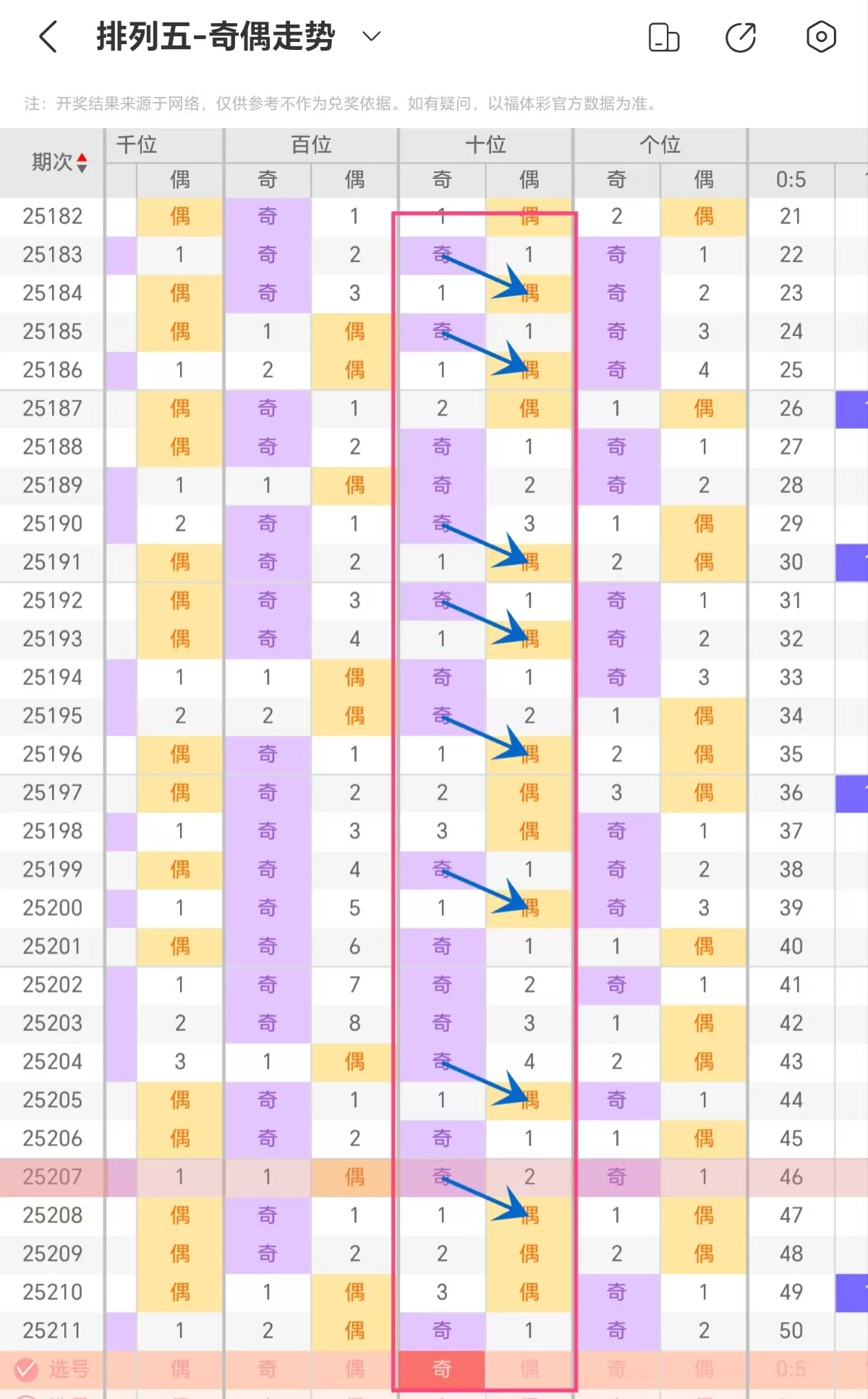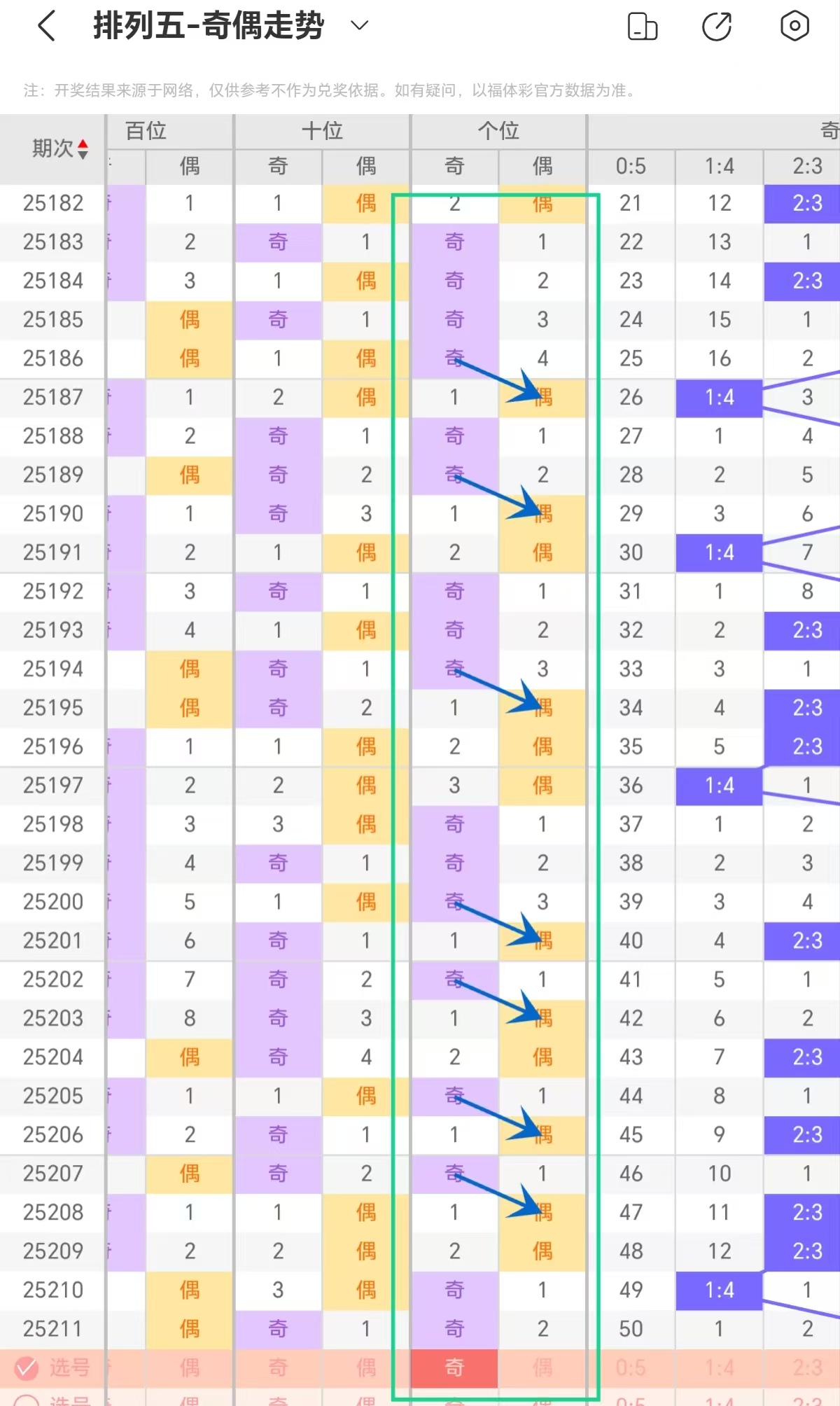 根据上图排列五十位奇偶形态走势分析,奇数、偶数交替出号,偶有连下阶段,展现较强趋势性。连下后,另一属性以回补姿态登场,打破单一形态。回补节奏灵活,有时快速介入,有时稍作停顿,让走势层次丰富。整体十位奇偶在连下与回补的动态平衡中变化,反映出出号的关联性与复杂性,本期参考奇数连下(13579)