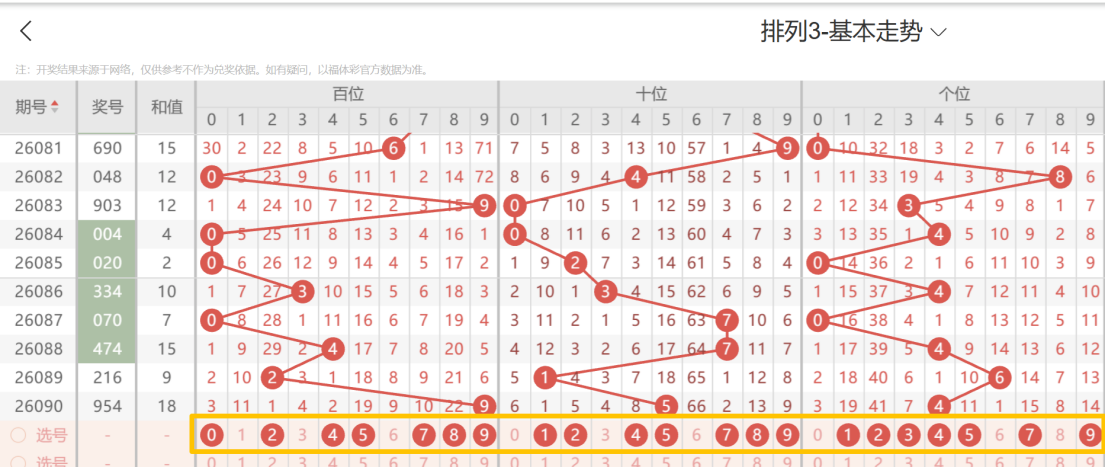 百位:近 10 期百位开出 6、0、9、0、0、3、0、4、2、9,七码覆盖 90% 近期开奖号,适配递减 / 凸形态。