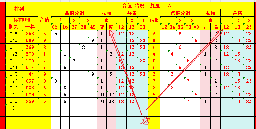 将合值按05-16-27-38-49分组;将跨度按12-34-56-78-90分组,设定“重邻隔”辨析指标;复盘数据,构建走势图如下: