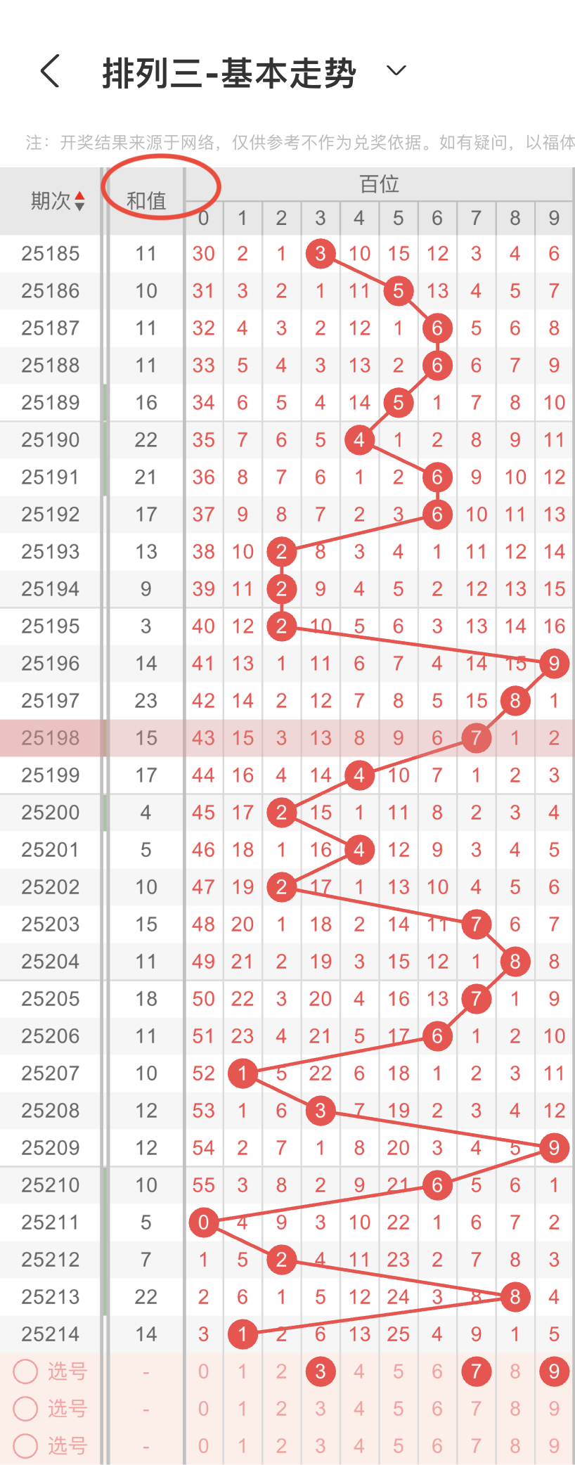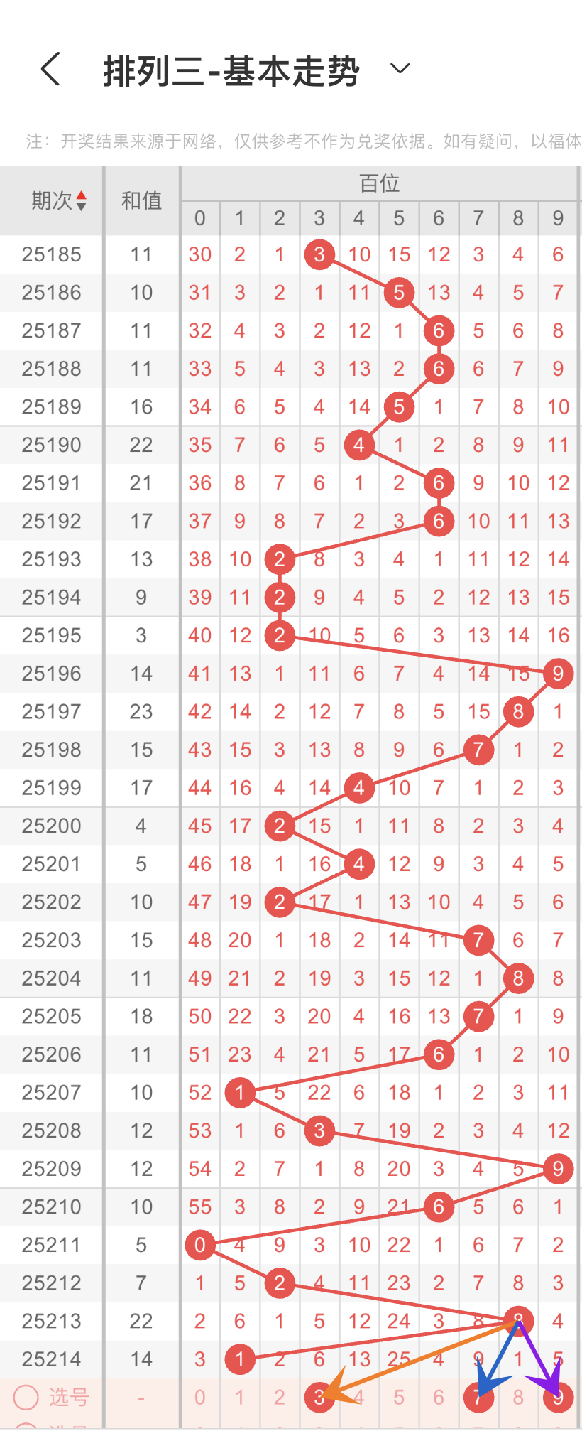 结合上面的大小、奇偶以及012路比,我们可以得到的数据分别是第一组56789,第二组13579,第3组0369,我们重点选择3组数据中重复的,那百位我们选择9,防0路的3,1路的7,综上所述百位选379