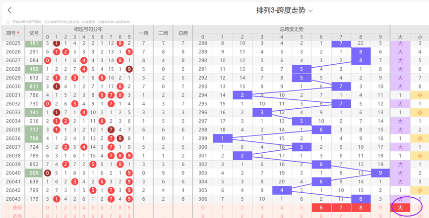 通过观察跨度及跨度属性走势可以发现:近10期内跨度较少开出01等号码,本期跨度大概率不会开出01等号码,因此本期跨度选号时可以优先排除01等号码,再结合上述走势图看,本期跨度看好678等号码。