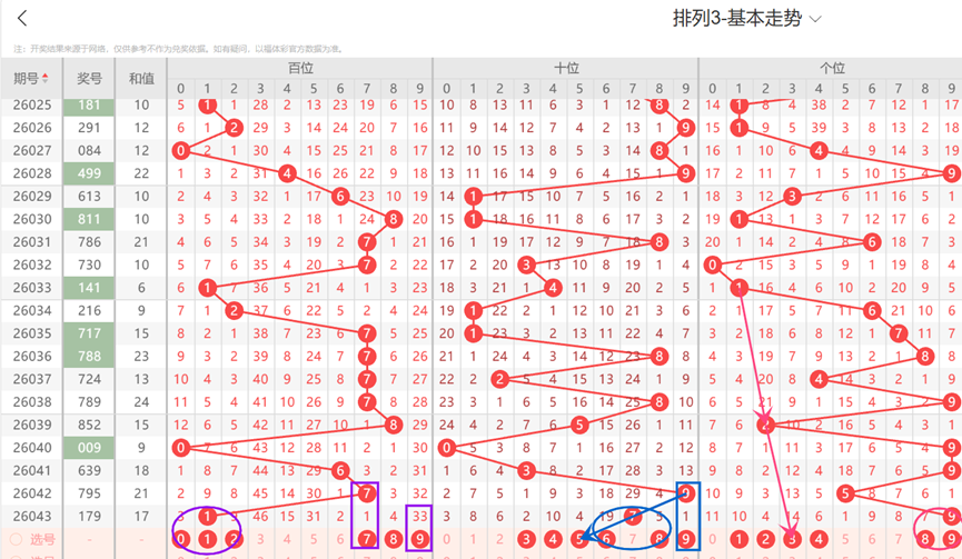 上一期百位开出号码为1,为奇数、小数、质数、1路号码:近10期百位较少开出345等号码,本期百位大概率仍然不会开出345等号码,因此本期百位选号时可以优先排除345等号码,结合上述走势图看,本期百位看好012789等号码。