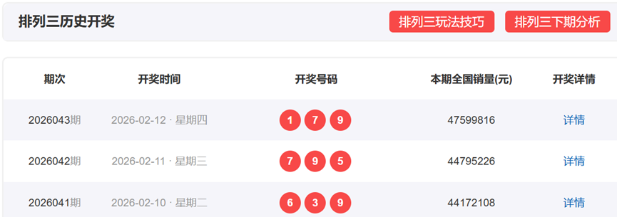 体彩排列3上一期,开奖号码为179,形态为组六,奇偶比为3:0,012路数值表现为110,和值17,和尾7,跨度8。