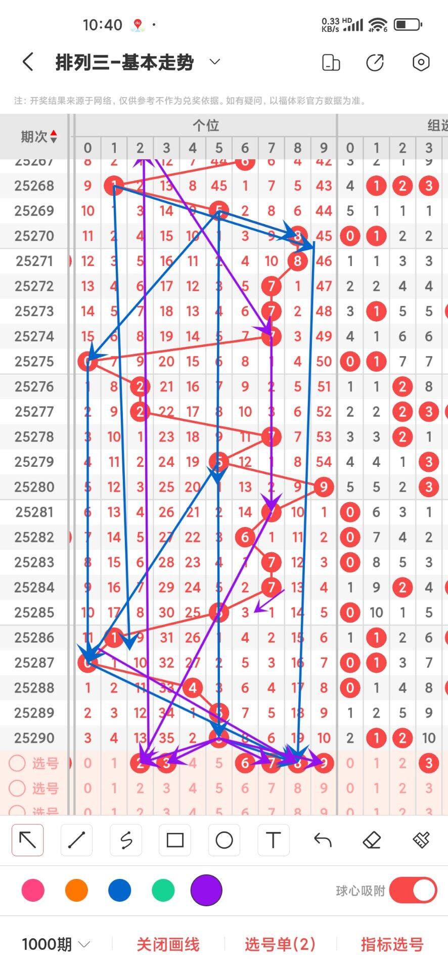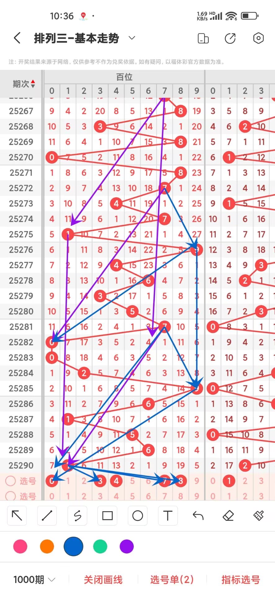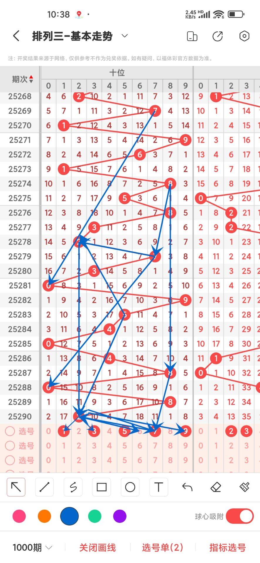 2025291上期个位开出奇数5,我们通过走势图来看1000期,012路中平均遗漏和最大连出的数据,其中0路平均遗漏总数是38次,0369号码分别遗漏9,9,10,10次,我们在来看0路号码的最大连出3次,0369分别在1000期内最高是3连,分别是3,3,2,2,03最高3连出,再来看1路号平均遗漏总数26次,147号码分别遗漏是8,9,9次,在看1路号最大连出是3,147分别是3,2,3,17最高3连出,再回过头来看2路号平均遗漏总数是28,258号码分别遗漏是11,9,8次,2路号最高连出是3,258分别是2,3,3,,通过上面的走势分析我们可以看出目前567号码走势比较好,热号是57,2389号码走势就有点冷淡,今天个位我们重点关注23689,具体看下面走势图