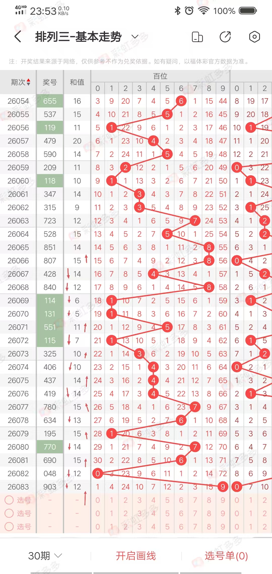 从走势图可以看出,近期幅度-1➕1-1-2-6-1➕6-4➕3-0➕4-0➕1-2➕2-1➕1-3-0,上下幅度6左右,近10期多上下走势,上期持平,本期有上升走势,综合和值在11-19之间,
