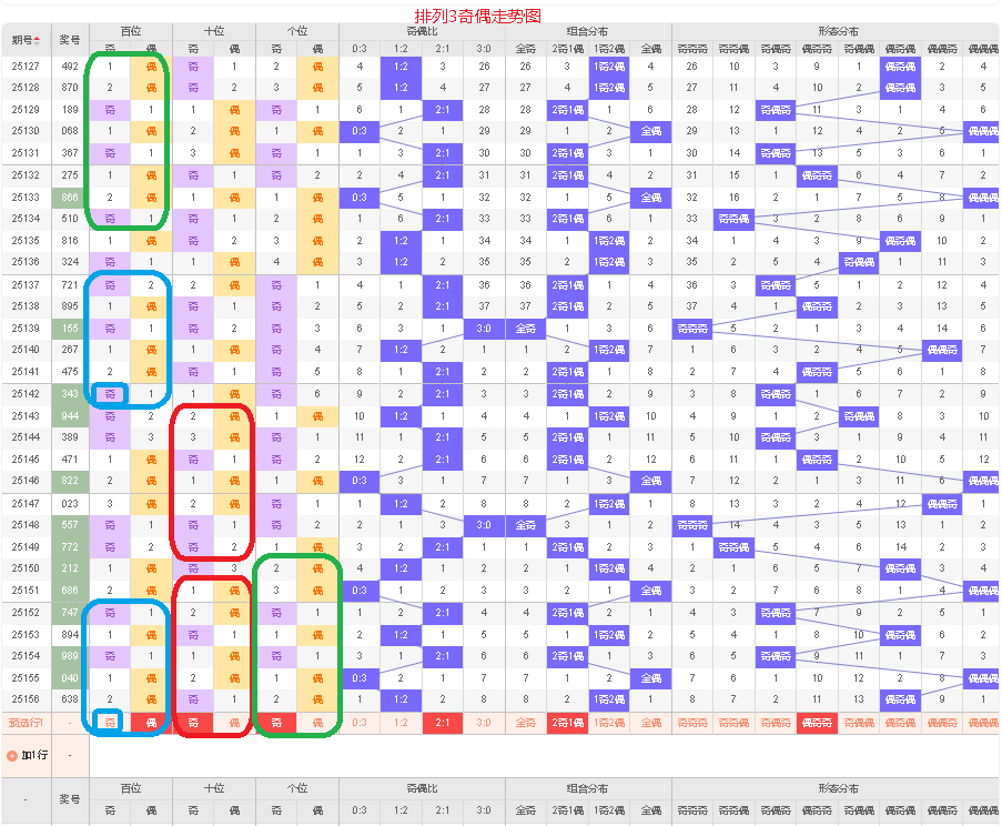 上一期的奇偶比为1:2,两偶号码组合,从近五期的奇偶数出现情况看,奇数出6次,偶数出现9次,奇数号码出现较少,本期要侧重两奇的号码组合,侧重偶奇奇或偶奇偶的号码组合,根据奇偶组合形态可做五码定位02468/13579/13579或02468/13579/02468