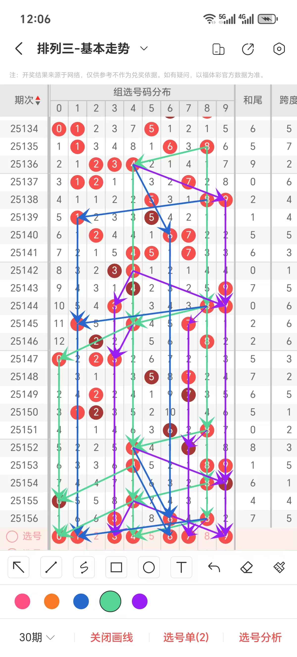 跨度通常情况下在五期之内重复一个跨度的概率较高,近五期重复了5的跨度,近五期跨度为3/5/1/4/5,近期12路的跨度较热,本期要侧重4/6跨为主的号码组合。选择好跨度就可以从跨度方面选择相应的双胆码组合,双胆码的选取要根据近期和历史的走势进一步的分析选取。