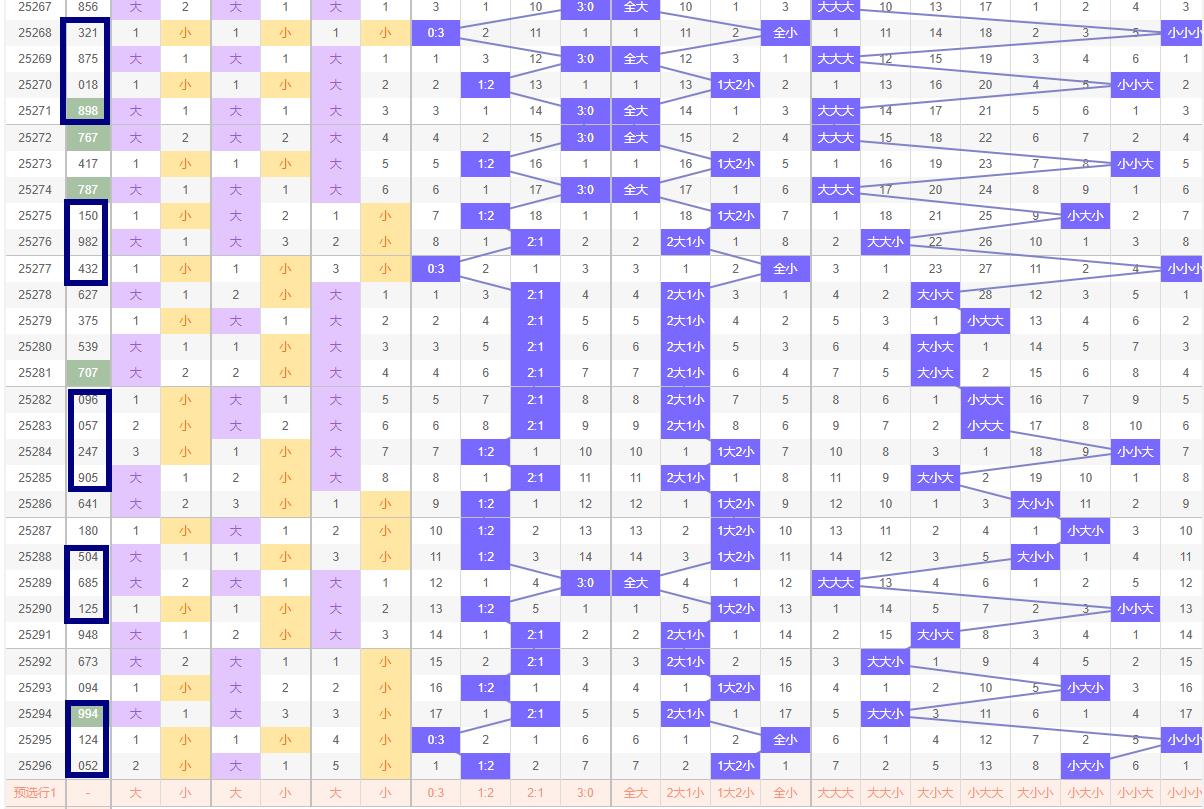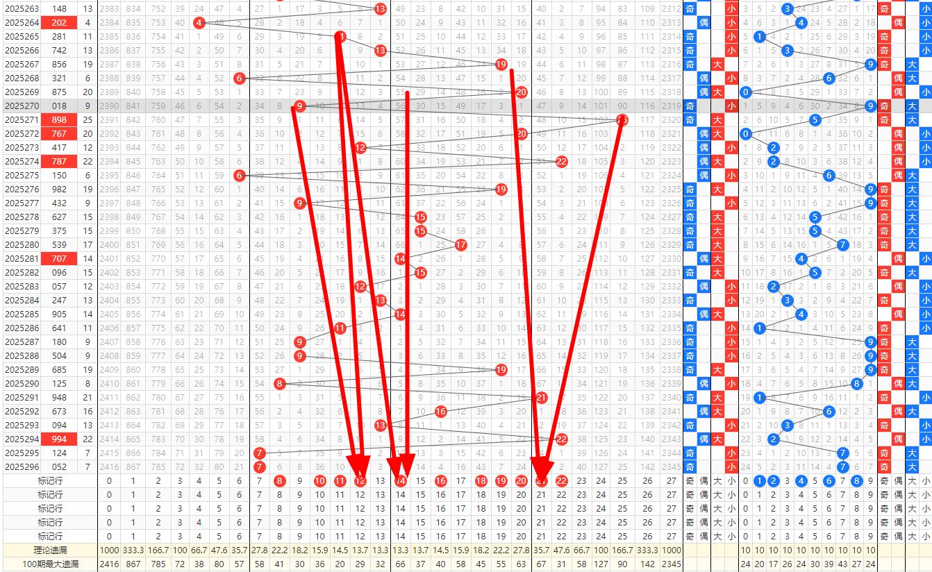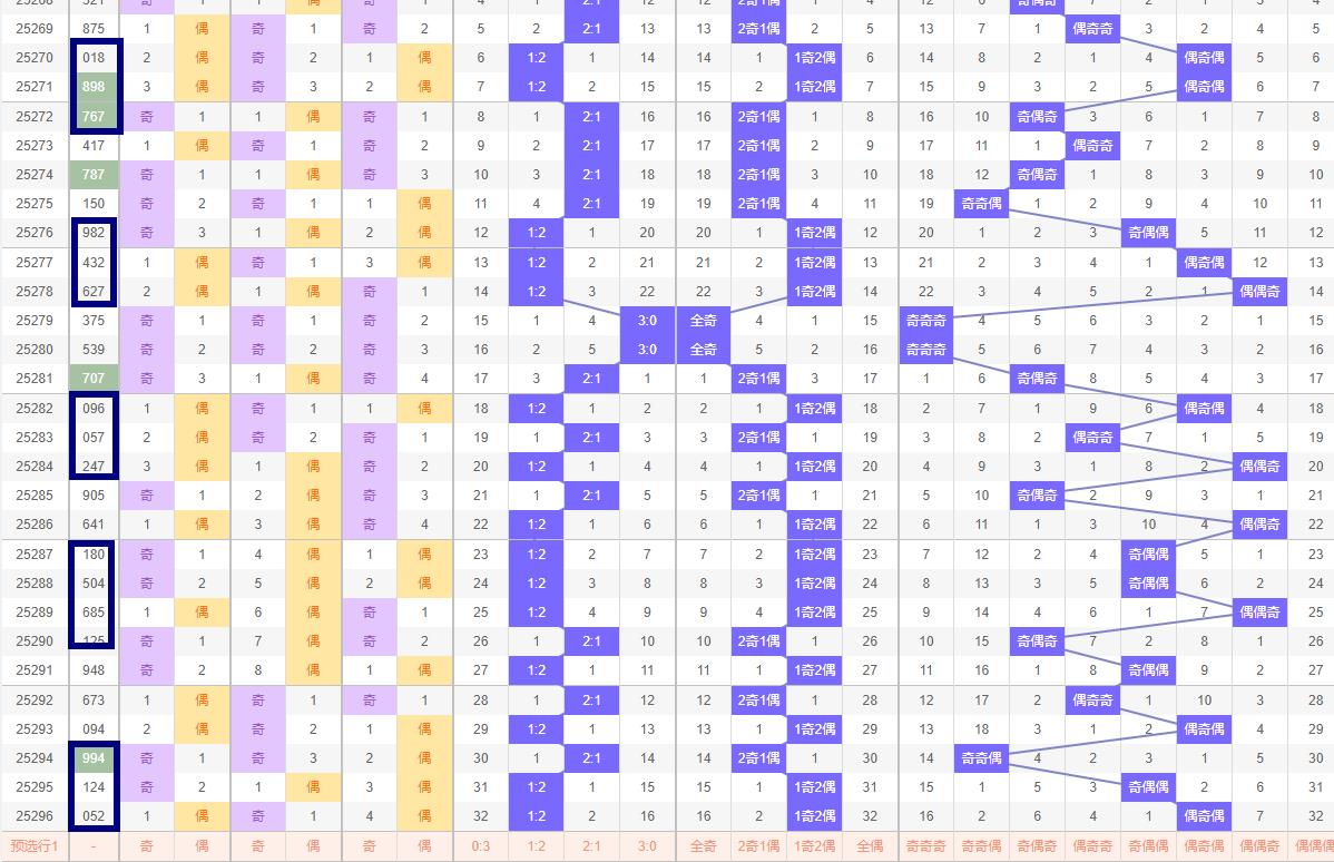 奇偶比例预判 在奇偶比例方面,第296期开出了052偶奇偶的组合,显示出偶数号码的强势。然而,根据奇偶比例的自然平衡原理,奇数号码在第297期有望得到更多的关注。因此,297期的奇偶比例可能为1:2或2:1,即奇数号码占据多数。这种预判基于对历史数据的深入分析,以及对奇偶比例波动规律的把握。