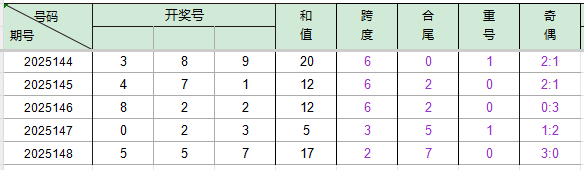 2025144期开奖号码389,我们可以看出近30期百位3出现4次(较146期减一),十位8出现3次,个位9出现2次。