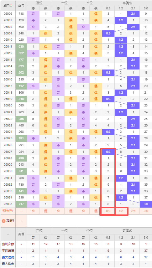 上期奇偶比:3:0,近10期奇偶比出现情况:2:1、0:3、2:1、2:1、2:1、1:2、2:1、2:1、1:2、3:0,最近10期出现6期2:1,出现2期1:2,出现1期0:3,出现1期3:0,根据近10期出号规律本期推荐对称的0:3,防隔期出1:2,综上所述奇偶比推荐:防:1:2,重点关注:0:3。