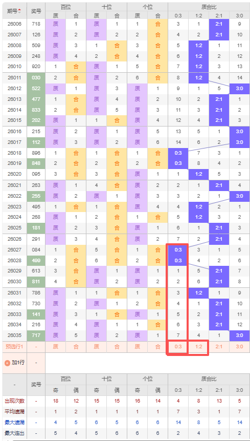 上期质合比:3:0,近10期质合比出现情况:2:1、0:3、0:3、2:1、2:1、1:2、2:1、2:1、2:1、3:0,最近10期出现6期2:1,出现1期1:2,出现2期0:3,出现1期3:0,根据近10期规律本期推荐开对称的0:3,防遗漏4期出1:2,综上所述质合比推荐:防:1:2,重点关注:0:3。