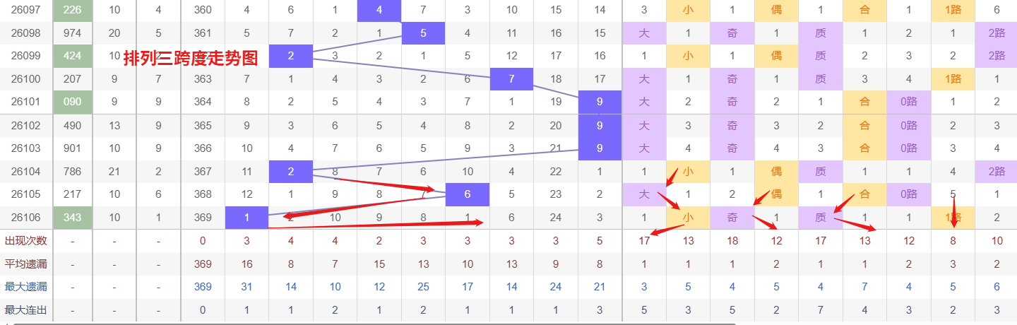 排列三 跨度分析:从上图可以看出近100期的跨度大小比约为55比45,跨度奇偶比约为47比53总体来看还是比较均衡的,但跨度大小之间有点差异。我们再从历史开出1跨后下一期4跨度数据来做参考。最近10期跨度大小比约为4:6期开出大数跨度过多返回小数跨度的概率更高一点。历史开奖近2期出1跨以后的走势为017期开出1跨后下一期走3跨走出2振幅,第036期开出1跨后下一期走7跨走6振幅第054期开出1跨后下一期开出4跨走出3振幅。连续多期大振幅,排列三跨度走势中,近期3跨作为热号表现活跃,出现频率明显领先于其他跨度值,从走势的延续性来看,热号往往具备连下的惯性,尤其在当前热度尚未明显衰减的情况下,3跨继续出现的可能性值得重点关注;与此同时,4跨则处于相对偏冷的状态,已经有一定时期未开出,从冷热均衡和回补规律的角度分析,这种冷态积累到一定程度后,往往会迎来一次反弹,跨度走出2到5个振幅看好的跨度有3458跨,所以第2026107期排列三跨度推荐3458跨。本文由一起彩钱是生命动力所著,请勿转载