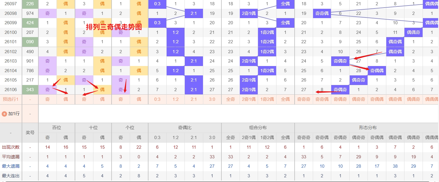 排列三 奇偶分析:从上图可以看出排列三100期内百位奇偶比约为45比55,十位奇偶比为51比49,个位奇偶比为54比46,十位的比值比较均衡,但是百位的比值偏差就有点大,历史奇偶形态近2期开出奇偶奇后下一期的走势为,第014期开出奇偶奇后015期开奇奇偶, 第025期开出奇偶奇后第026期开偶偶偶,第037期开出奇偶奇后第038期开奇奇奇,排列三奇偶走势中,近期奇奇偶形态表现活跃,作为热号出现频率明显偏高,从走势惯性和热号延续规律来看,这种强势形态往往具备连下的动能,尤其是当热度尚未出现明显转折信号时,奇奇偶”续开出的可能性值得重点关注;与此同时,奇奇奇则处于相对偏冷的状态,已经有一定时期未出,从冷热均衡和回补规律的角度分析,冷号积累到当前程度后,反弹的概率正在逐步上升,所以排列三2026107期奇偶形态推奇奇偶与奇奇奇。本文由一起彩钱是生命动力所著,请勿转载