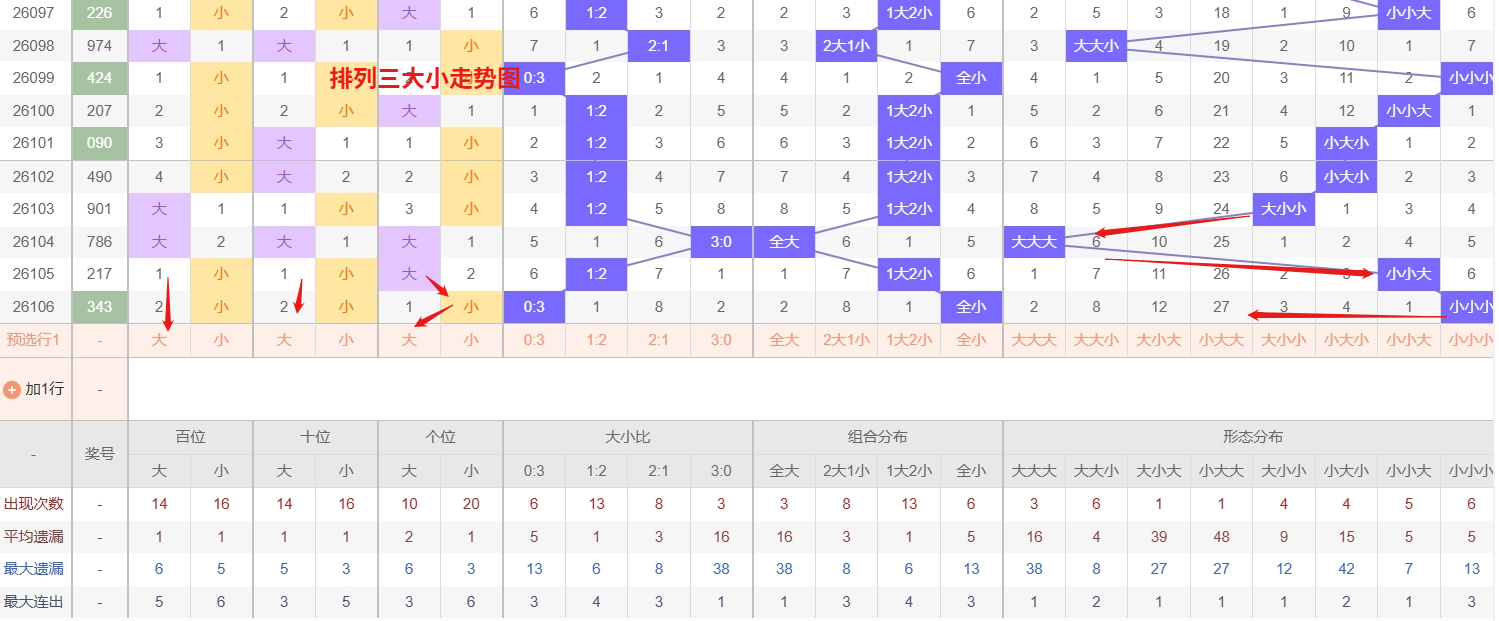 排列三 大小形态分析:从大小走势图上可以看出排列三100期内百位大小比约为55比45,十位大小比约为48:52,个位大小比约为51比49,除了个位和百位奇数比偶数多,十位偶数比奇数多。历史数据近2期开出小小小下一期的走势为,第002期开小小小后第003期开大大小。第013期开出小小小后第014期开大大大,第037期开出小小小后038期开小大小。排列三大小走势中,近期大大小作为热号表现活跃,出现频率明显领先于其他形态,从走势惯性和热号延续规律来看,这种强势形态往往具备连下的动能,尤其在热度尚未出现明显转折信号时,大大小继续开出的可能性值得重点关注;与此同时,大大大目前处于温号状态,虽不算深度冷号,但已有一段时间未出,从走势轮动和回补规律的角度分析,温号往往具备随时转热的潜力,尤其是在热号连续开出后,所以排列三第2026107期大小形态推荐大大小防大大大本文由一起彩钱是生命动力所著,请勿转载