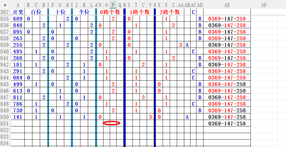 如上图56,012路分析0路出号的概率还是很大,本期可以从0路号入手做胆0369中选;看好369胆码。