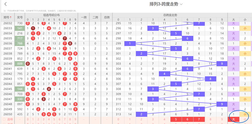 通过观察跨度及跨度属性走势可以发现:近10期内跨度开出小数号码后,下期较少连开小数号码,上期跨度开出了小数号码2,因此本期跨度选号时应该考虑大数号码,再结合上述走势图看,本期跨度看好567等号码。