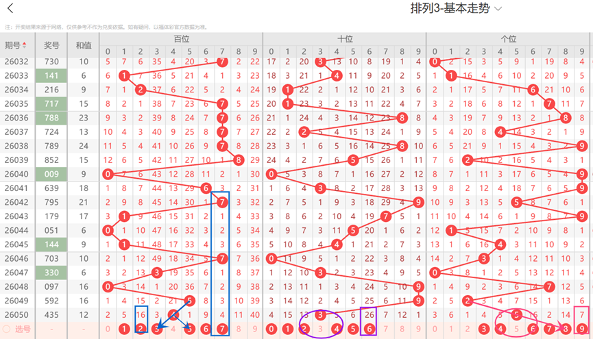 上一期十位开出号码为3,为奇数、小数、质数、0路号码。近10期内十位较少开出78等号码,本期十位大概率仍然不会开出78等号码,因此本期十位选号时可以优先排除78等号码,结合上述走势图看,本期十位看好012456等号码。