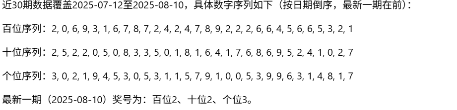 针对百位、十位和个位进行统计分析。分析聚焦于近30期数据(从2025-07-12至2025-08-10),并参考最新一期奖号(2025-08-10:百位2、十位2、个位3)。分析内容包括: