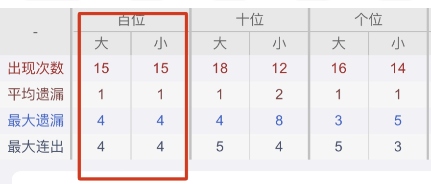 近30期期开出的号码大小比为15比15,本着大小比例将趋近平衡,上期开出大数8,那么本期我们可以将大数56789作为备选