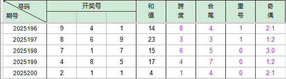 2025196期开奖号码941,我们可以看出近30期百位9出现4次,十位4出现3次,个位1出现5次。