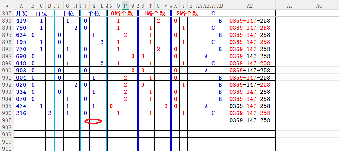 如上图56,012路分析0路出号的概率还是很大,本期可以0路号入手做胆0369中选;看好369胆码