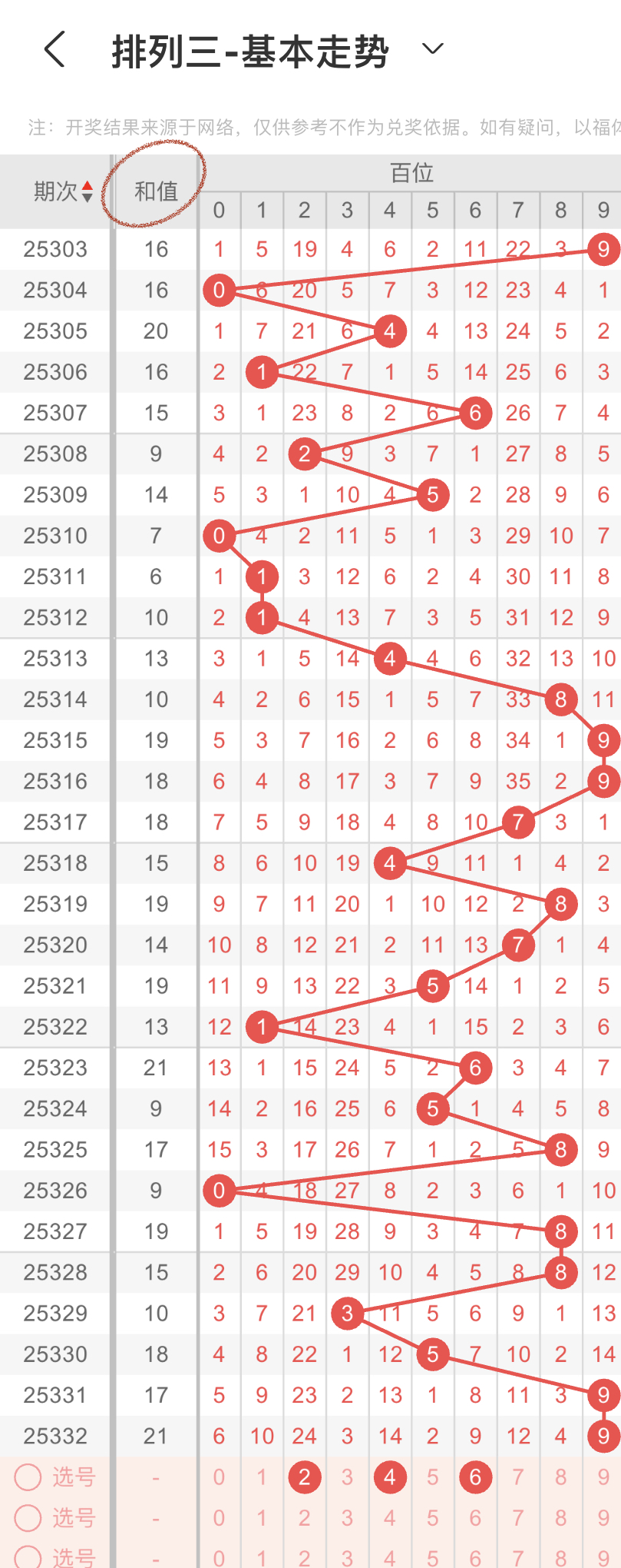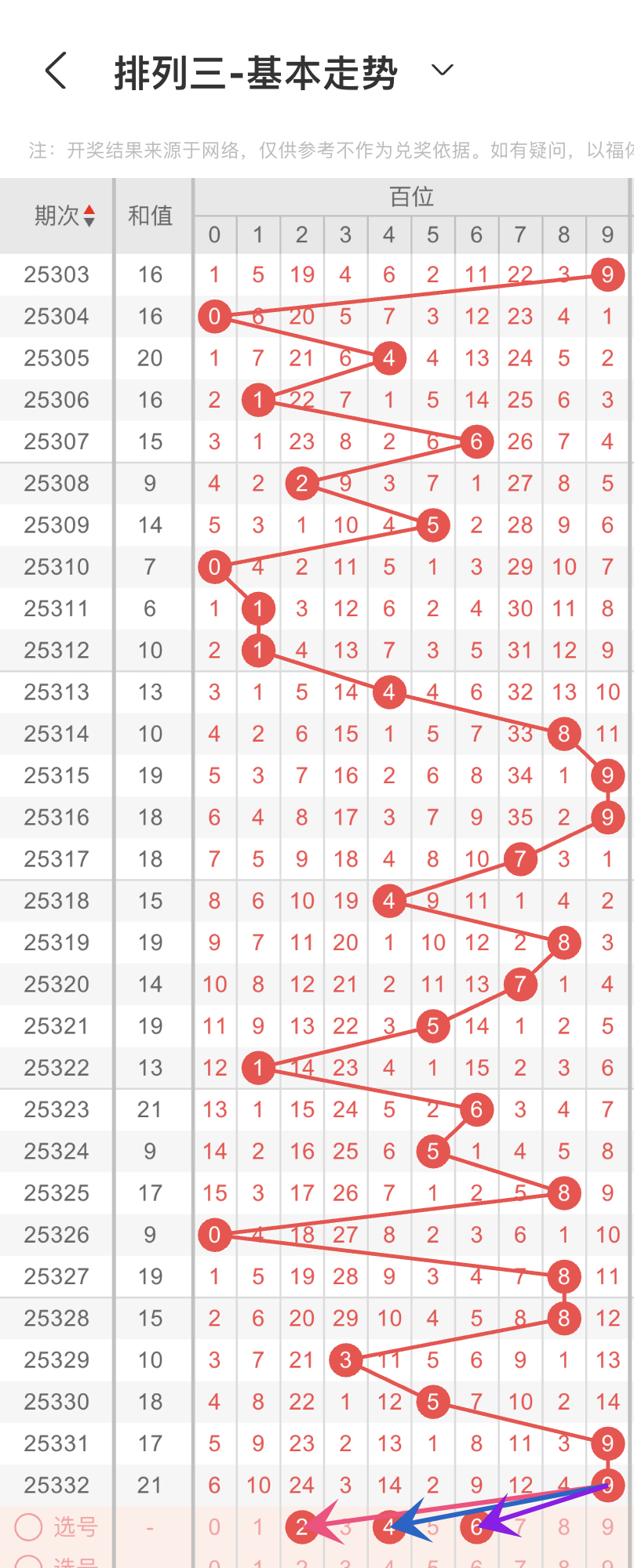 结合上面的大小、奇偶以及012路比,我们可以得到的数据分别是第一组01234,第二组02468,第三组258,我们重点选择3组数据中重复的,那百位我们选择2,防0路的6,1路的4,综上所述百位选246