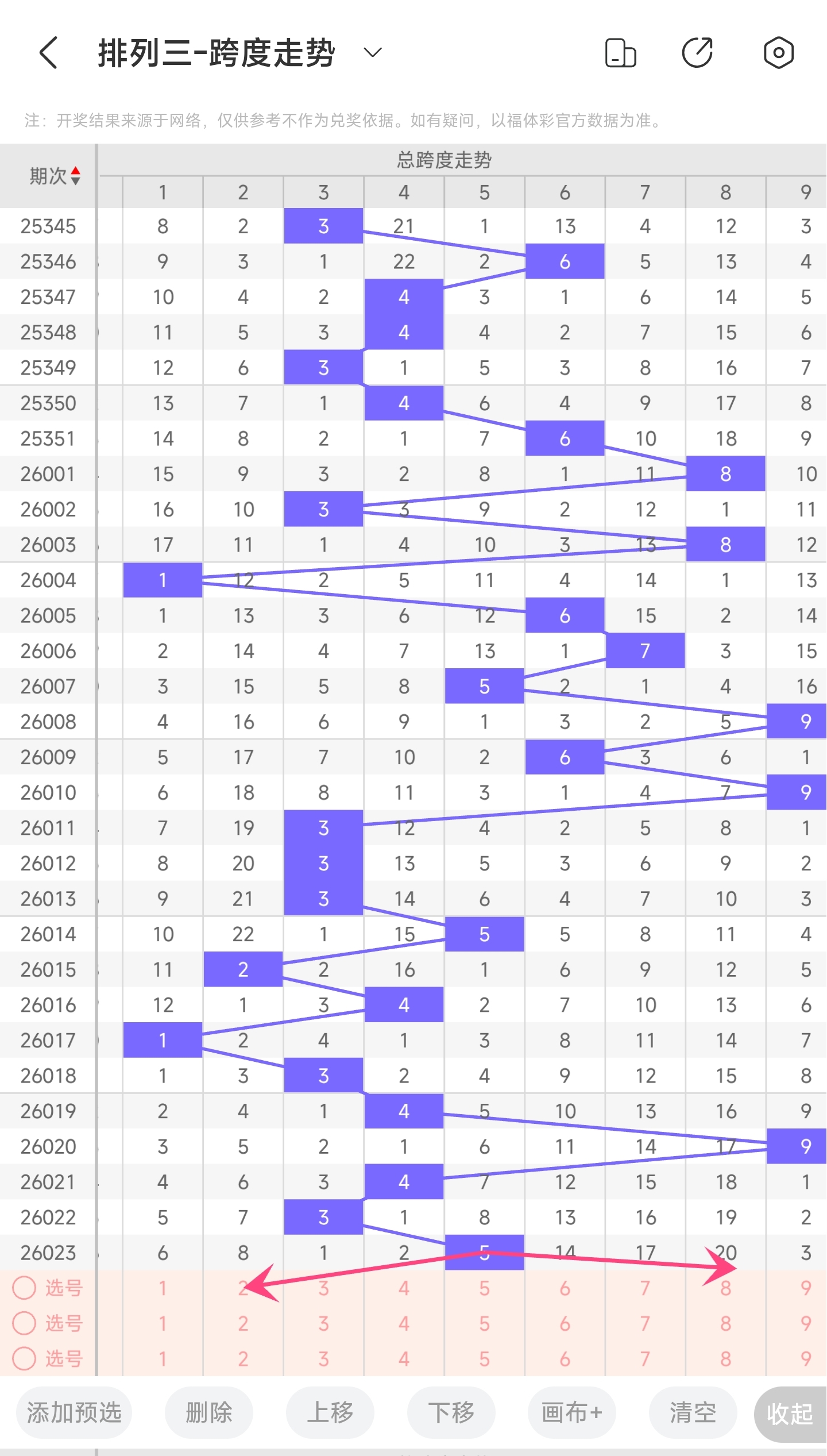 上期跨度为5,往前一期跨度是3,趋势往右移动,偏移量为2。跨度值5时,跨度值是近30期开出中间位置的值。通过走势图分析,目前的趋势是可能往左也可能往右。所以推测本期跨度可能为34679等跨度。