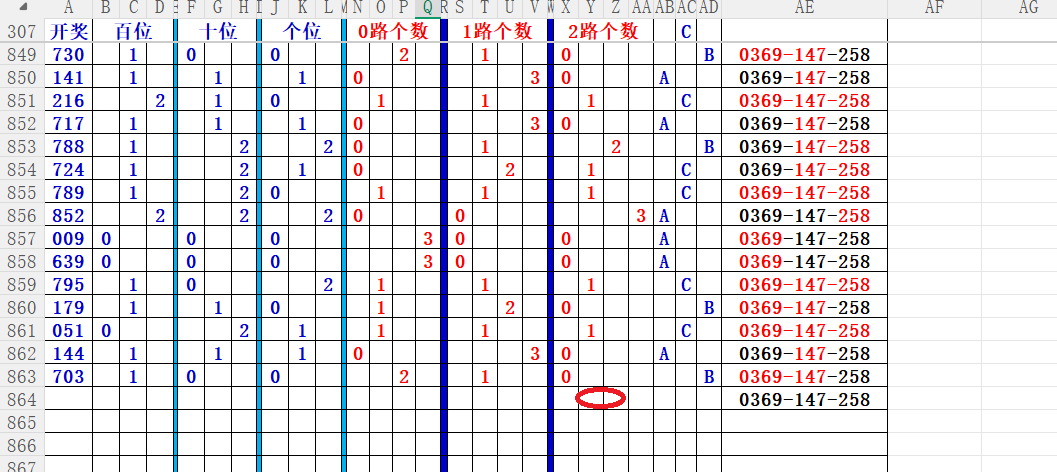 如上图56,012路分析0路出号的概率还是很大,本期可以0路号入手做胆0369中选;看好369胆码