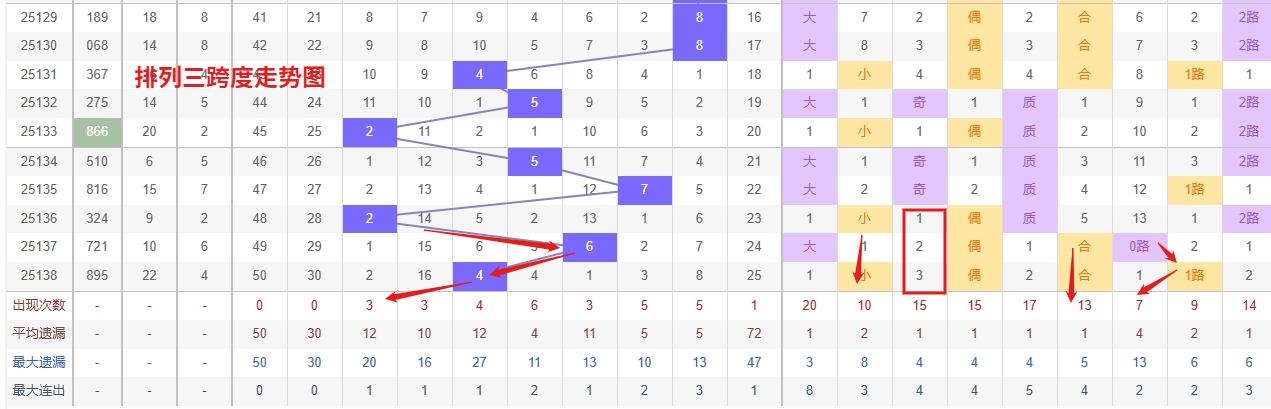 排列三 跨度分析:从上图可以看出近100期的跨度大小比约为53比47,跨度奇偶比约为55比45总体来看还是比较均衡的,但跨度大小之间有点差异。我们再从历史开出4跨后下一期2跨度数据来做参考。最近10期跨度大小比约为5:5近期开出大数跨度过多返回小数跨度的概率更高一点。历史开奖近2期出4跨以后的走势为045期开出4跨后下一期走2跨走出2振幅,第057期开出4跨后下一期走8跨走出4振幅第061期开出4跨后下一期开出1跨走出3个振幅。连续多期小振幅。近期排列三跨度走势中,5跨和8跨表现强势,热度较高,短期内仍有连开可能,可优先关注。从历史数据来看,热跨往往具备一定持续性,结合其他指标综合判断,适当跟进。同时,冷跨1跨、2跨等也需留意回补机会, 综合以上分析后得出,本期预计跨度遵从历史会走小振幅,出4跨度后容易走出1到4个跨度振幅的对称形态。跨度走出1到4个振幅看好的跨度有1258跨,所以第2025139期排列三跨度推荐1258跨。