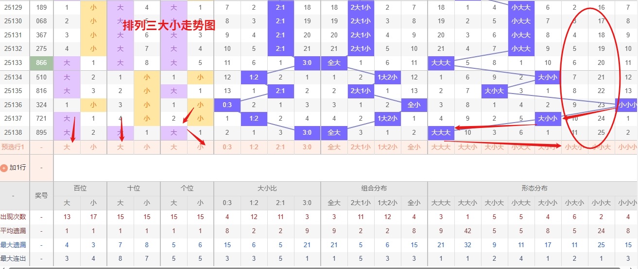 排列三 大小形态分析:从大小走势图上可以看出排列三100期内百位大小比约为52比48,十位大小比约为46:54,个位大小比约为51比49,除了十位奇数比偶数多,百位和个位是偶数比奇数多。历史数据近2期开出大大大下一期的走势为,第045期开出大大大第046期开小大小。第057期开出大大大后第058期开小小大,第062期开出大大大后063期开小大大。可以看出开出大大大的时候,结合遗漏数据再加上开出大大大形态后容易进行下一个类型变化。近期排列三大小走势中,"小大小"组合表现活跃,呈现较强热度,短期内仍有持续开出的可能,可优先关注。而"小小大"组合长期未现,遗漏值较高,需重点防范其冷态回补。投注时以热态组合为主,同时合理配置冷门组合,所以排列三第2025139期大小形态推荐小大小防小小大。