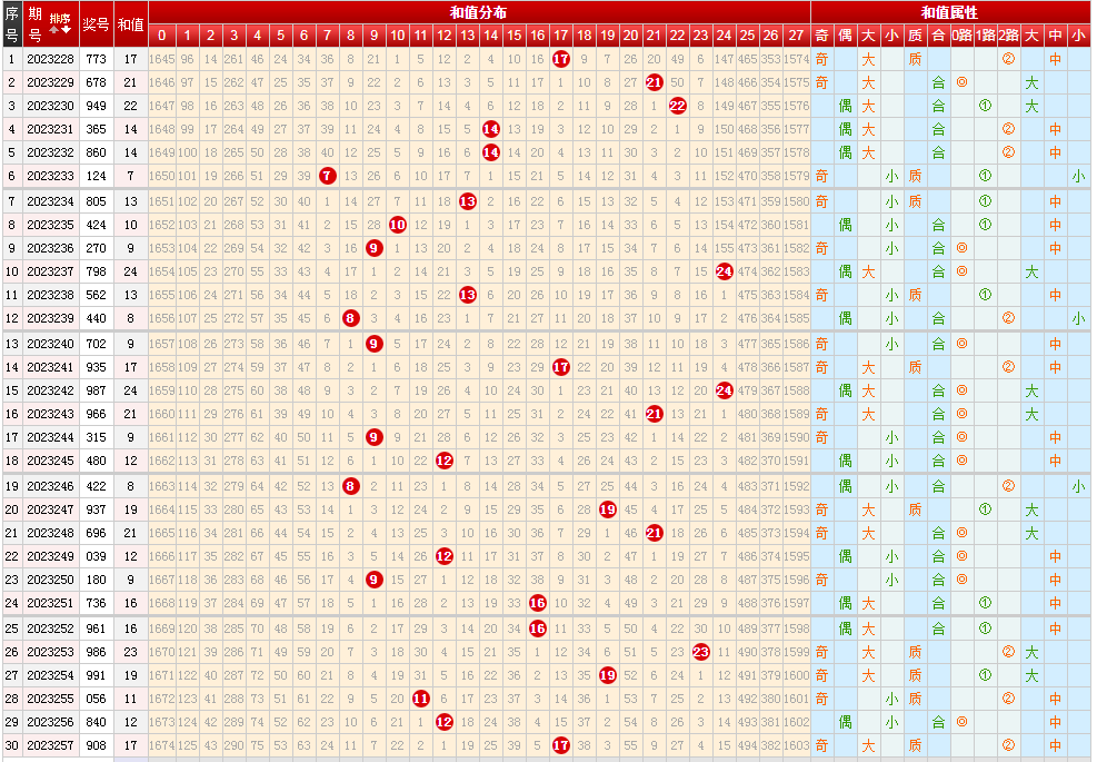 我们来看看排列3最近三十期开奖号码的和值分布及属性