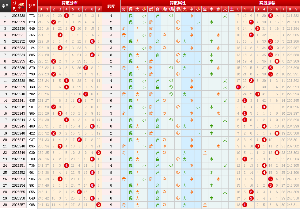 我们来看看排列3最近三十期开奖号码的跨度分布及属性