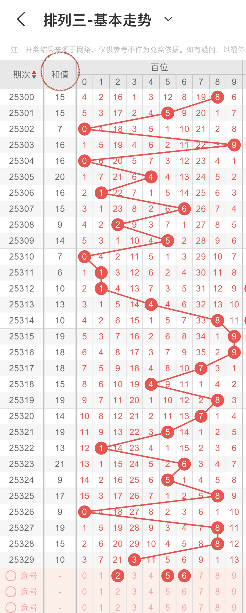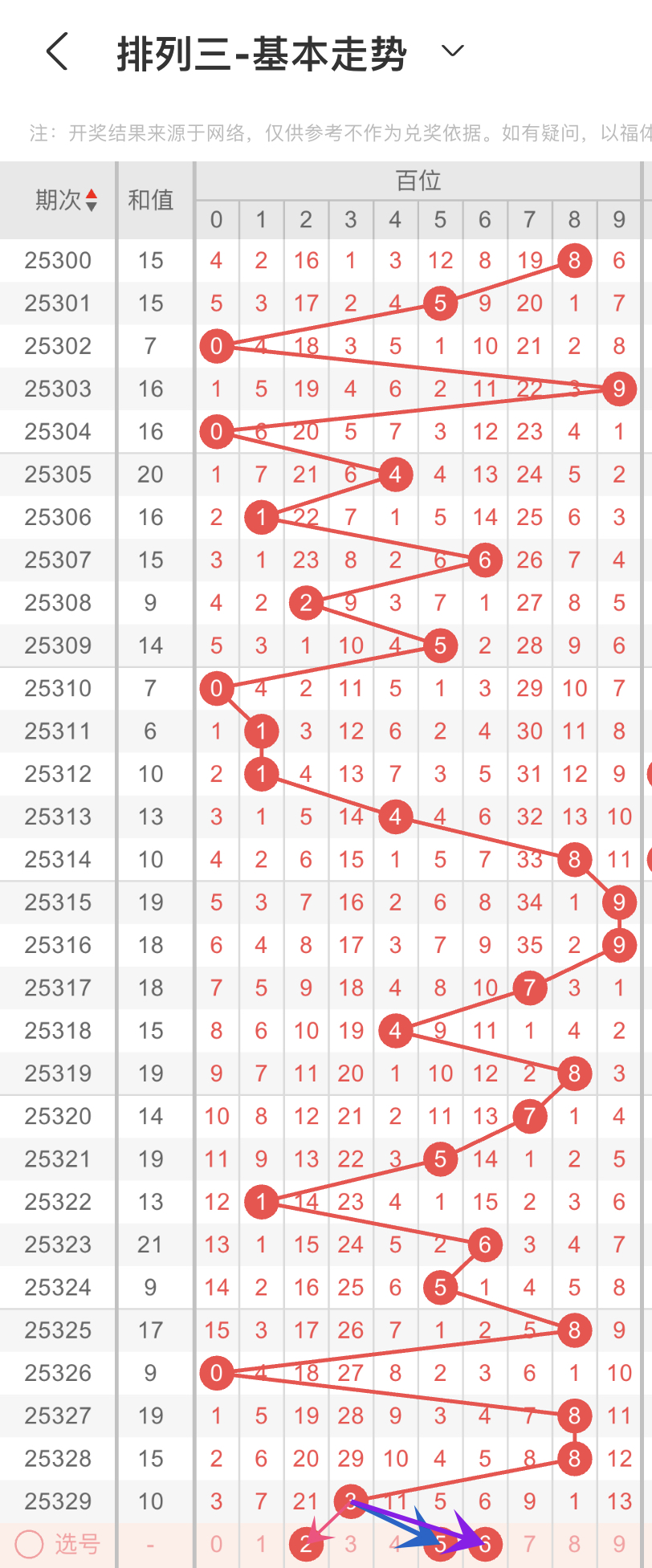 结合上面的大小、奇偶以及012路比,我们可以得到的数据分别是第一组56789,第二组13579,第三组258,我们重点选择3组数据中重复的,那百位我们选择5,防0路的6,2路的2,综上所述百位选256