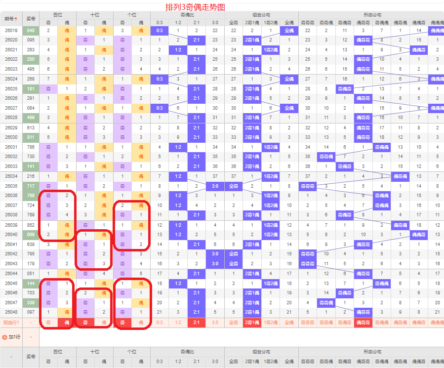 上一期的奇偶比为2:1,两奇的号码组合,从近五期的奇偶数出现情况看,奇数出9次,偶数出现6次,奇数号码出现较多,本期要侧重两奇的号码组合,侧重偶奇奇或偶奇偶的号码组合,根据奇偶组合形态可做五码定位02468/13579/13579或02468/13579/02468