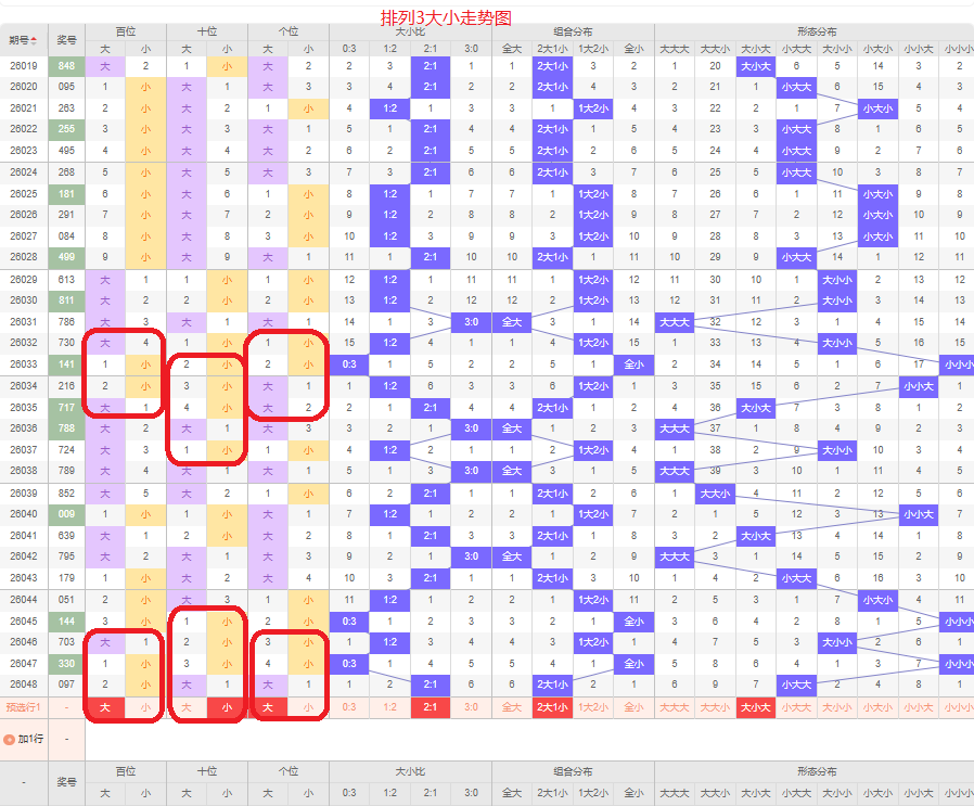 百位近两期是小号码,侧重偶数的号码,侧重大号码,侧重1路和2路的号码,侧重号码34678。