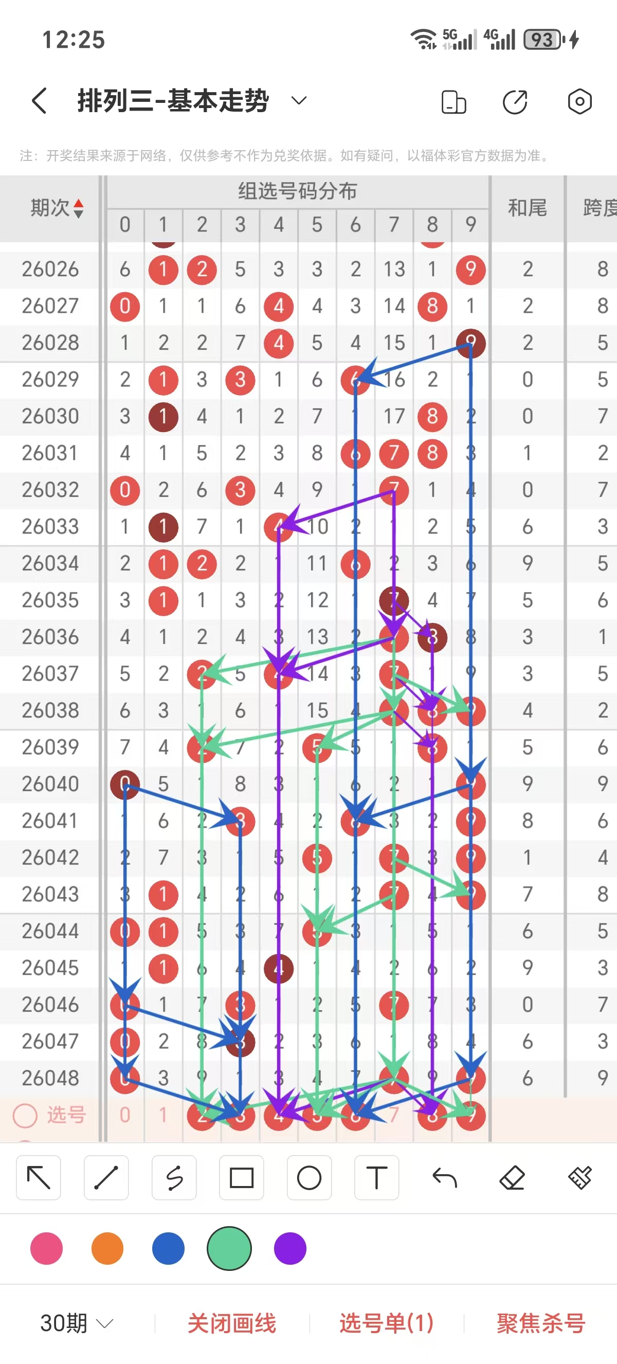 通常情况下在五期之内重复一个跨度的概率较高,近五期重复了3的跨度,近五期跨度为5/3/7/3/9,近期0路的跨度较热,本期要侧重4/5/6跨为主的号码组合。选择好跨度就可以从跨度方面选择相应的双胆码组合,双胆码的选取要根据近期和历史的走势进一步的分析选取。