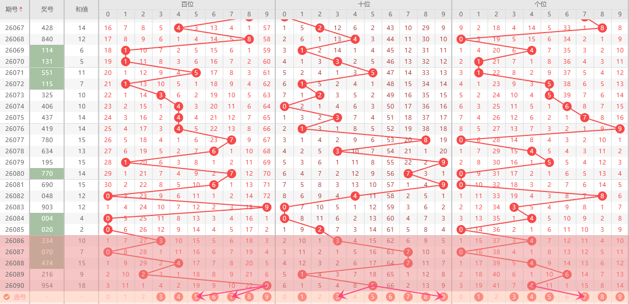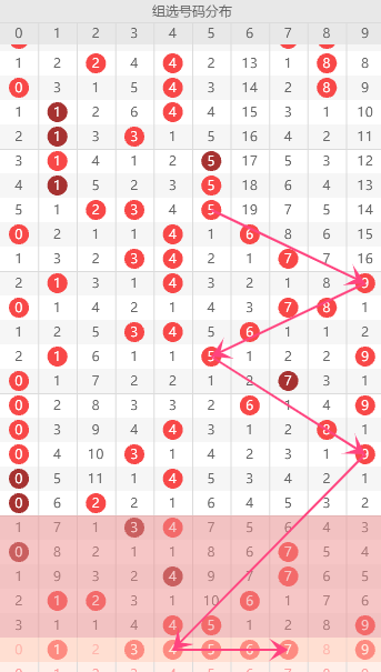 结合近10期开奖结果分析,号码:0-4出现了4次以上,表现较为活跃,根据热码继续走热的特性,可将它们列为热号重点,本期可以关注继续出球。再结合组选走势图分析值得重点关注!综合以上冷热码走势1-3-4-5-6-7-9