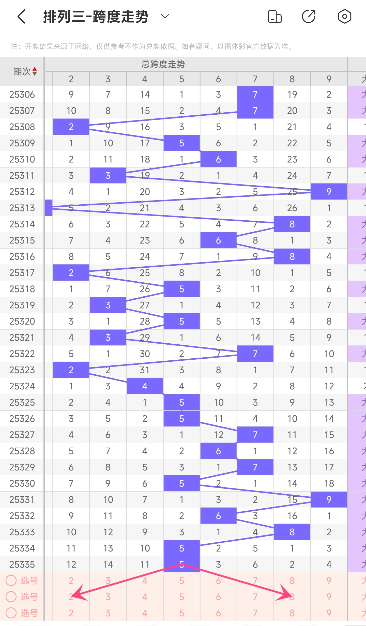 上期跨度为5,往前一期跨度是5,趋势没有移动,偏移量为0。跨度值5时,跨度值是近30期内开出中间位置的值。通过走势图分析,目前的趋势是可能往左也可能往右。所以推测本期跨度可能为46789等跨度。
