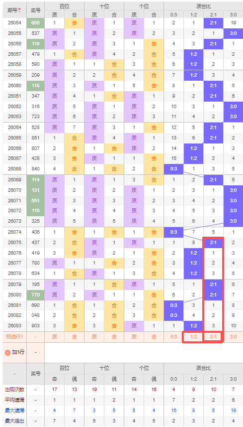 上期质合比:1:2,近10期质合比出现情况:0:3、2:1、1:2、1:2、1:2、2:1、2:1、0:3、0:3、1:2,最近10期出现3期2:1,出现4期1:2,出现3期0:3,出现0期3:0,根据近10期规律本期推荐遗漏3期的2:1,防连出2:1,综上所述质合比推荐:1:2,重点关注:2:1。
