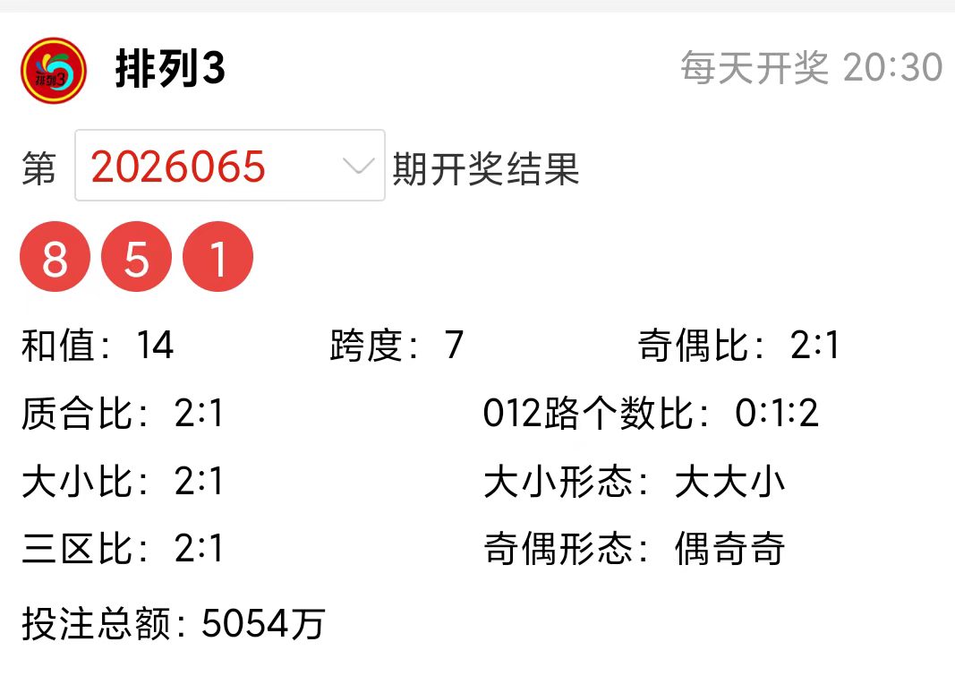 排列3上期(2026065)开奖号码详情