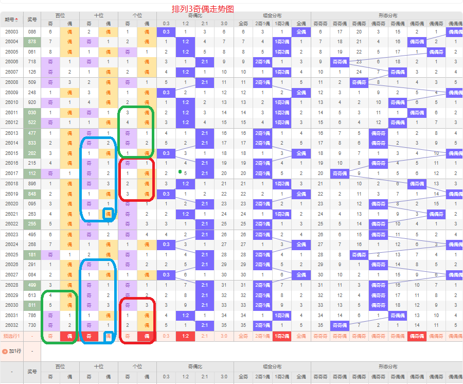 上一期的奇偶比为2:1,两奇的号码组合,从近五期的奇偶数出现情况看,奇数出9次,偶数出现6次,奇数号码出现较多,本期要侧重两偶的号码组合,侧重偶奇偶或奇奇偶的号码组合,根据奇偶组合形态可做五码定位02468/13579/02468或13579/13579/02468