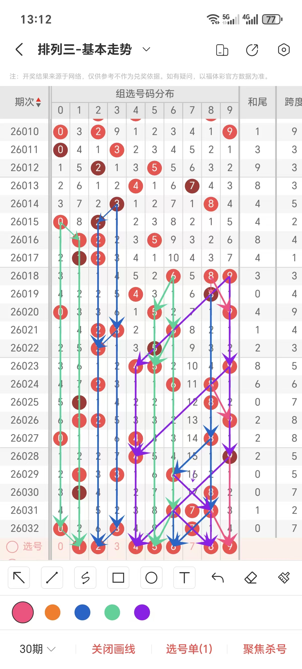通常情况下在五期之内重复一个跨度的概率较高,近五期重复了5/7的跨度,近五期跨度为5/5/7/2/7,近期12路的跨度较热,本期要侧重4/5/7跨为主的号码组合。选择好跨度就可以从跨度方面选择相应的双胆码组合,双胆码的选取要根据近期和历史的走势进一步的分析选取。